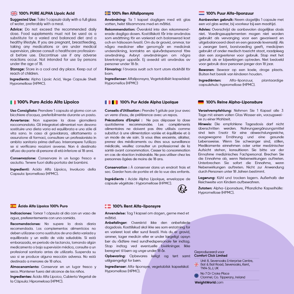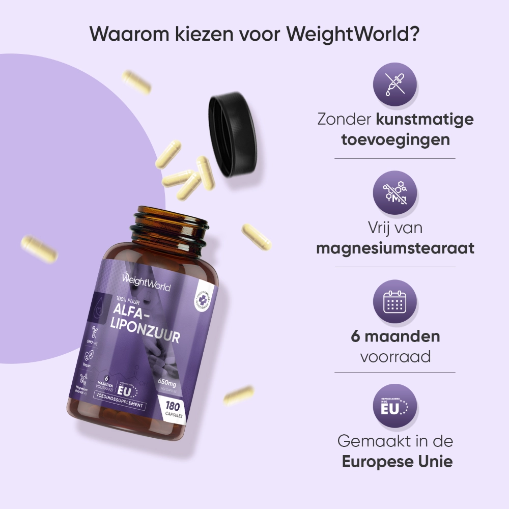 - Krachtige dosis van 650 mg Alpha Lipoic Acid (ALA) per capsule