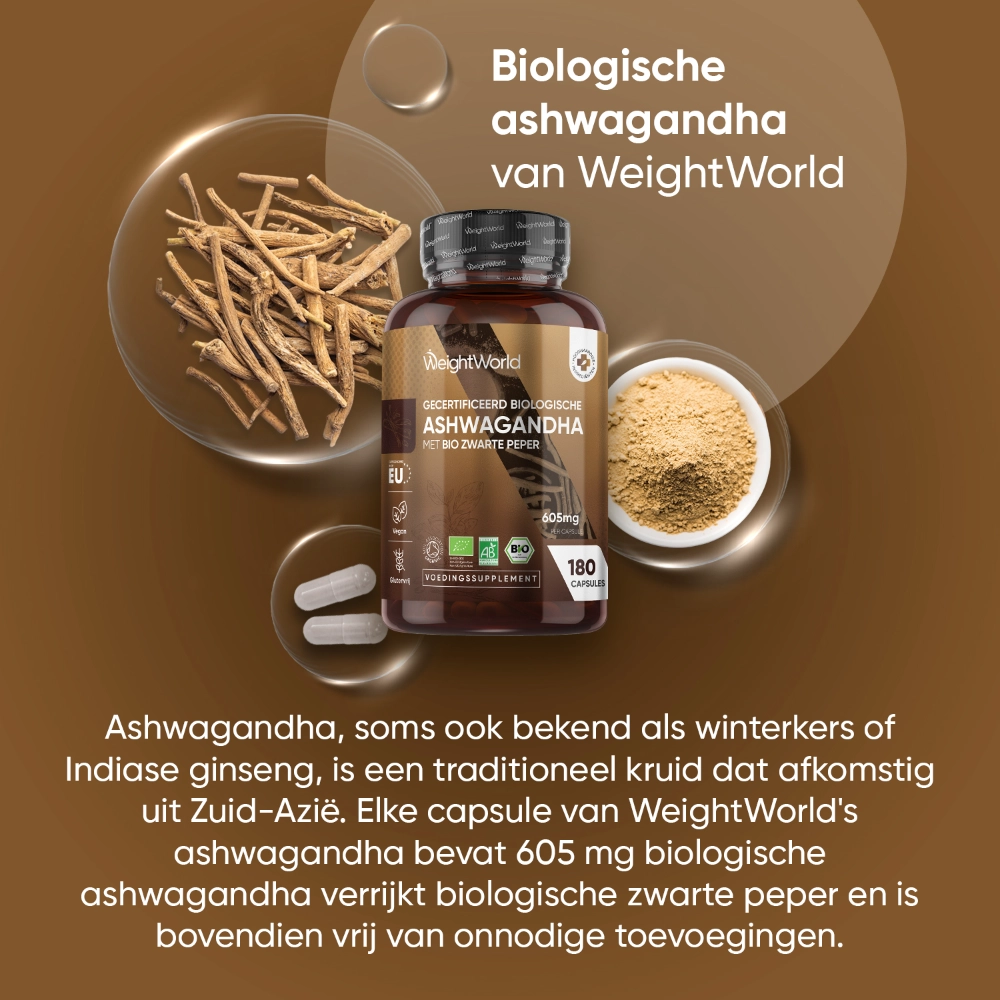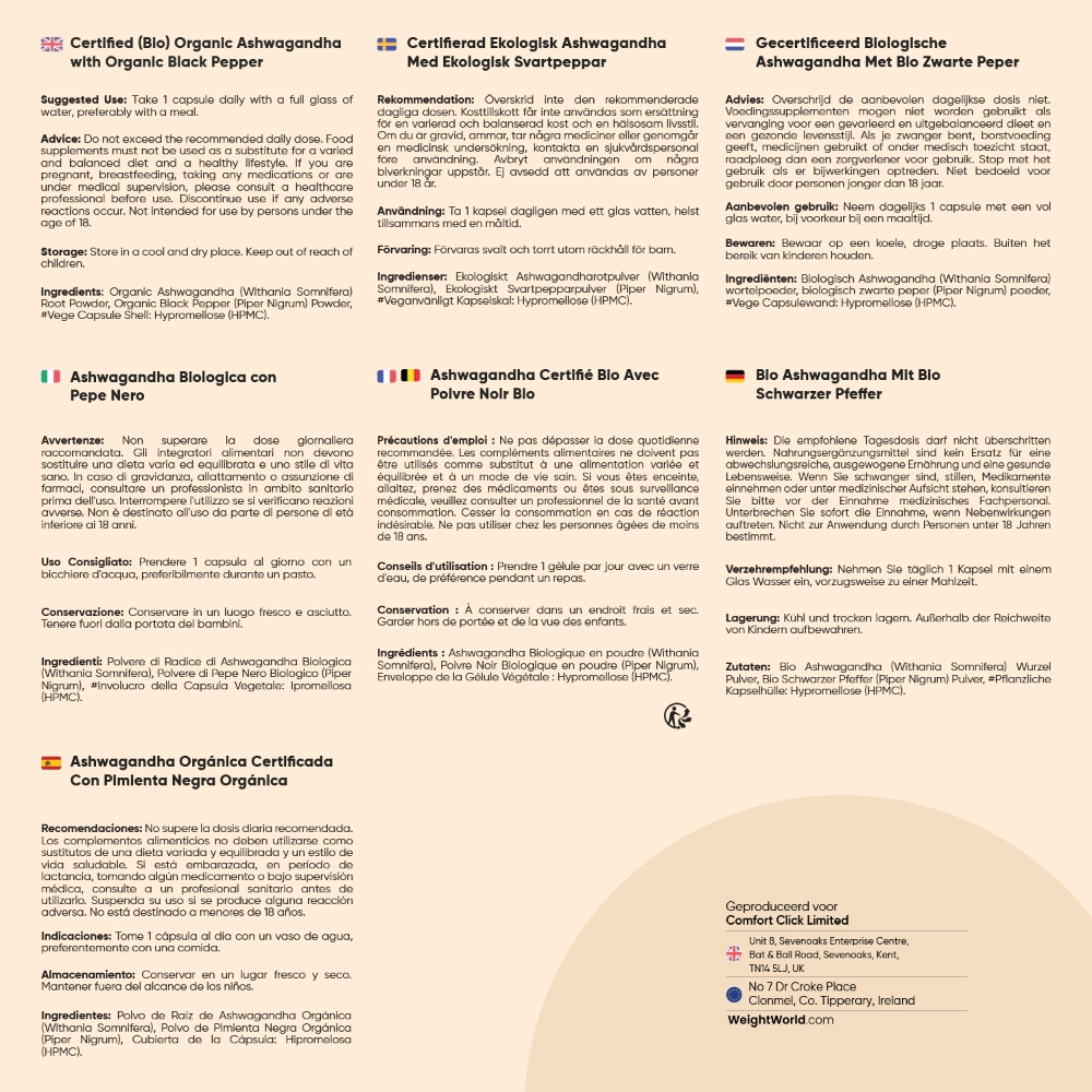 Biologisch Ashwagandha (Withania Somnifera) wortelpoeder, biologisch zwarte peper (Piper Nigrum) poeder, #Vege Capsulewand: Hypromellose (HPMC).