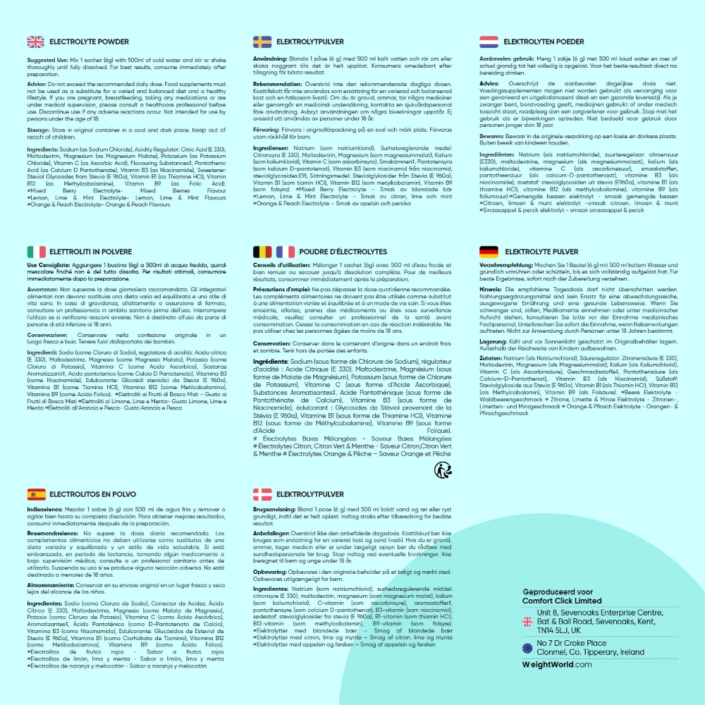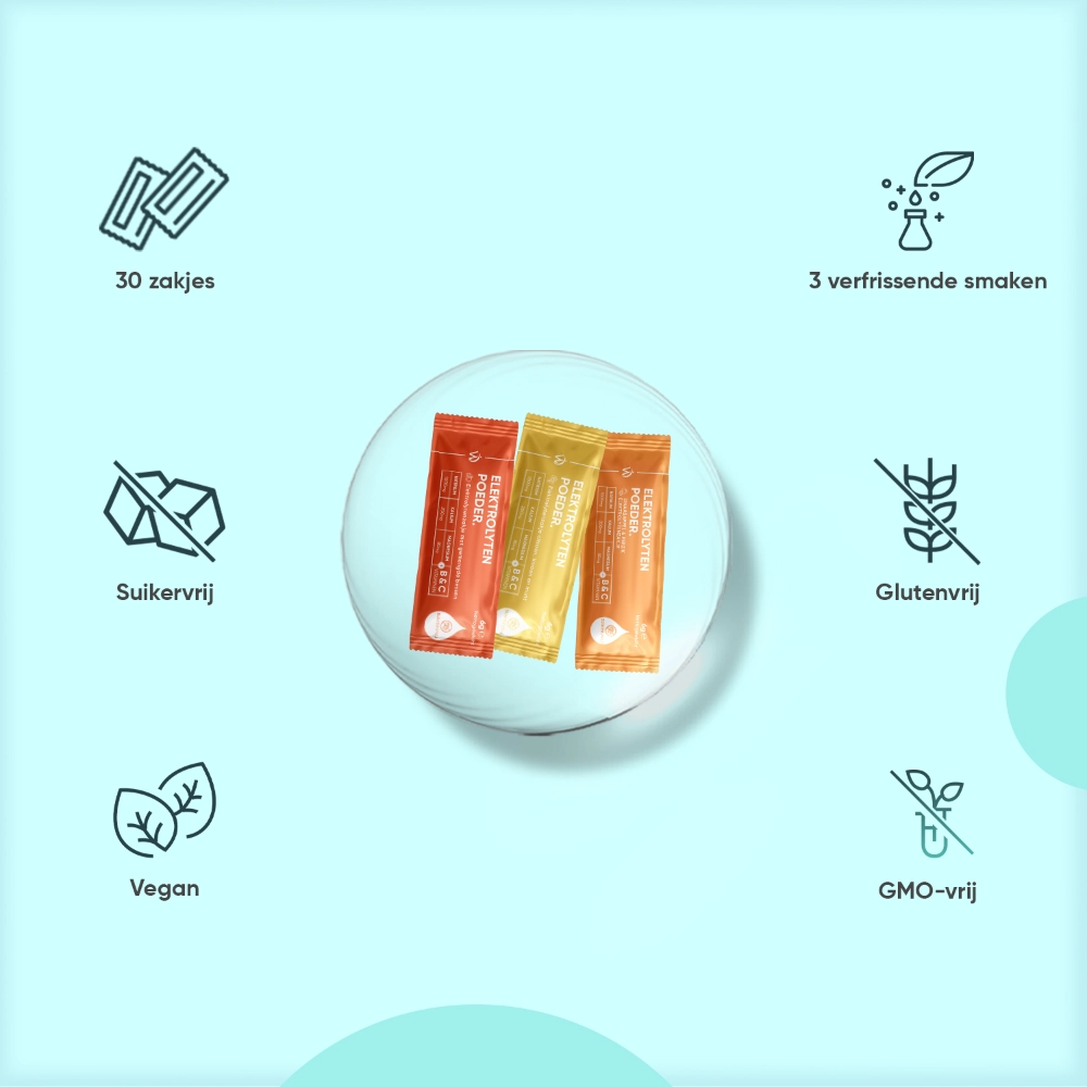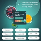 Natrium (als natriumchloride), zuurteregelaar: citroenzuur (E330), maltodextrine, magnesium (als magnesiummalaat), kalium (als kaliumchloride), vitamine C (als ascorbinezuur), smaakstoffen, pantotheenzuur (als calcium-D-panto- thenaat), vitamine B3 (als niacinamide), zoetstof: steviolglycosiden uit stevia (E960a), vitamine B1 (als thiamine HCl), vitamine B12 (als methylcobalamine), vit
