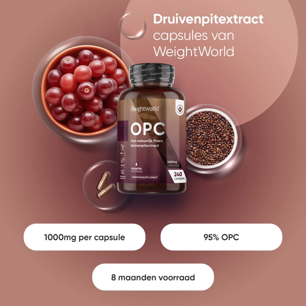 - 1000 mg druivenpitextract waarvan 950 mg OPC per capsule
