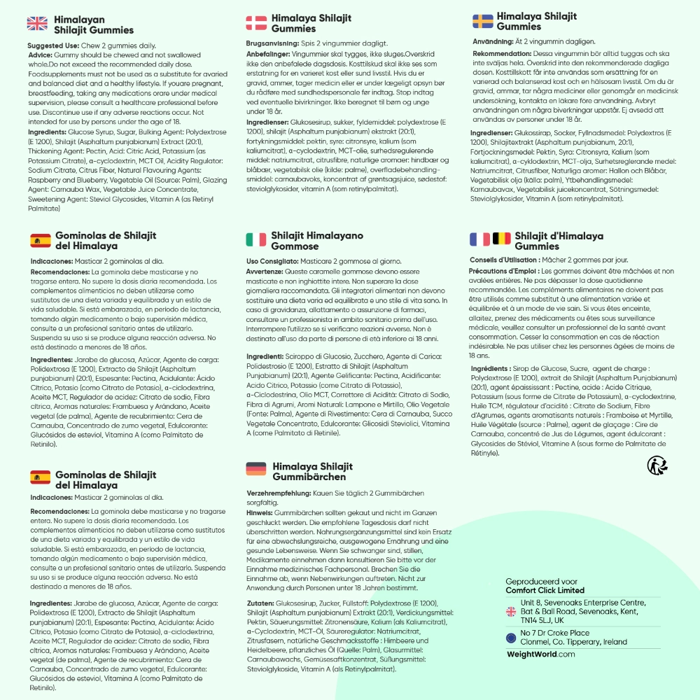 Glucosestroop, suiker, vulstof: polydextrose (E 1200), shilajit (asphaltum punjabianum) extract (20:1), verdikkingsmiddel: pectine, zuurteregelaar: citroenzuur, kalium (als kaliumcitraat), α-cyclodextrine, MCT-olie, zuurteregelaar: natriumcitraat, citrusvezels, natuurlijke smaakstoffen: framboos en bosbes, plantaardige olie (bron: palm), glansmiddel: carnaubawas, groentesapconcentraat, zoetstof: steviolglycosiden, vitamine A (als retinylpalmitaat).